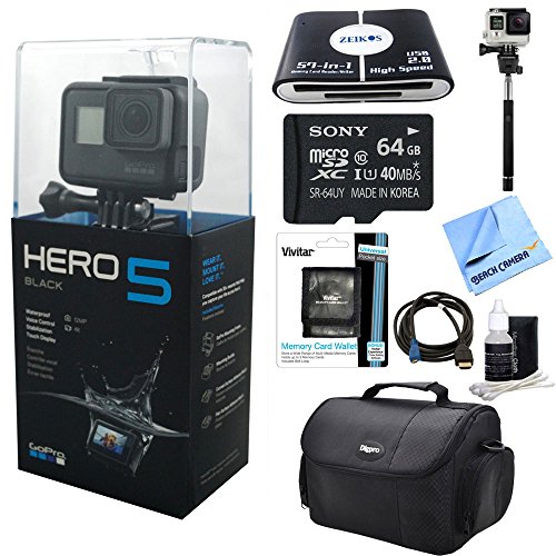 Camera Includes GoPro HERO5 Black Edition Action Camera 64GB microSD Memory Card GoPro Camera Case Tri-fold Memory Card Wallet Telescopic 43" Selfie Stick for GoPro Hero High Speed micro-HDMI to HDMI A/V Cable 6 Feet Hi-Speed SD and microSD USB 2.0 Card Reader Lens Cleaning Kit Microfiber Cleaning Cloth Simply the best GoPro, Ever.HERO5 Black is the most powerful and easy-to-use GoPro ever, thanks to its 4K video, voice control, one-button simplicity, touch display and waterproof design. Smooth stabilized video, crystal-clear audio and pro-quality photo capture combine with GPS to make HERO5 Black simply the best GoPro. And when its time to edit and share, HERO5 Black automatically uploads footage to your GoPro Plus cloud account to provide easy access on your phone. Then, you can create amazing videos automatically with Quik, the GoPro editing app. The Versatile GoPro FamilyWorks with 30+ GoPro official mounts and accessories. Product Details Voice Control. Enjoy hands-free control of your GoPro using simple voice commands.'GoPro, take a photo'. 2-inch Touch Display. Preview and play back your shots, change settings and trim your footage, all on your GoPro. Rugged + Waterproof. Durable by design, HERO5 Black is waterproof to 33 feet (10m) without a housing. Simple One-Button Control. A single press of the shutter button powers the camera on and starts recording automatically. Advanced Video Stabilization. HERO5 Black can capture stunningly smooth video handheld, mou...GoPro HERO5 Black Edition Action Camera64GB microSD Memory Card, Tri-fold Memory Card Wallet