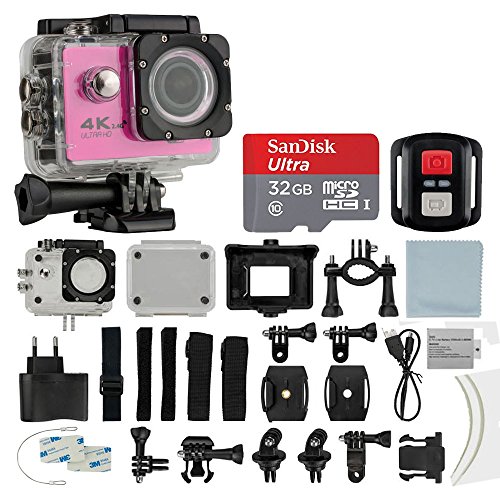 link : 4K HD DV 16MP Sports Action Camera, (Pink) - Wi-Fi + Wrist RF + 170° Wide Angle Lens + Waterproof Case & Backdoor + SanDisk 32GB Memory Card + Bike Mount + Clip Holder + Ultimate Accessory Bundle